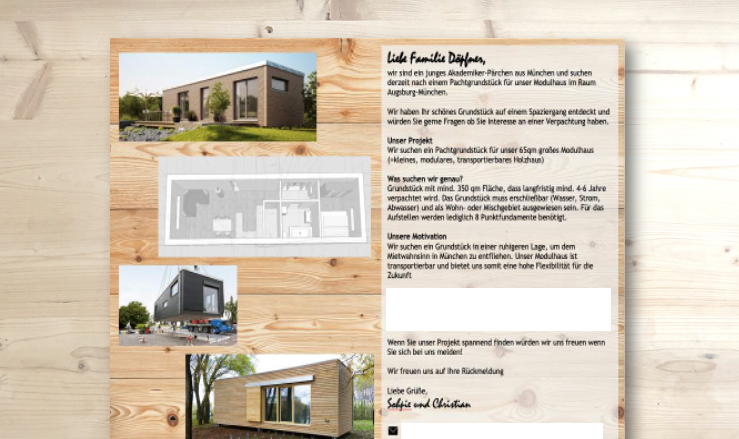 Vorlagen: Hier findest du ein Dokument mit Vorlagen für die Grundstückssuche. Exemplarische Beispiele für einen Flyer, Anzeigen und Annoncen.